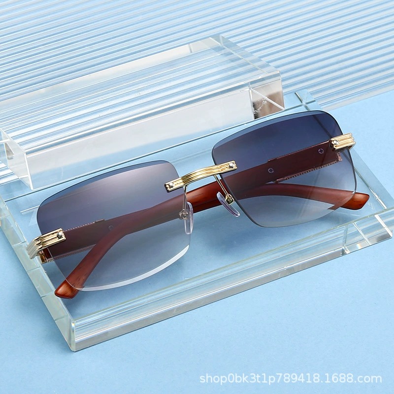 Men’s Euro-American Style Cross-Border Leopard Accent Rimless Edge-Cut Sunglasses – Premium Business Wood-Grain Metal Square Frame